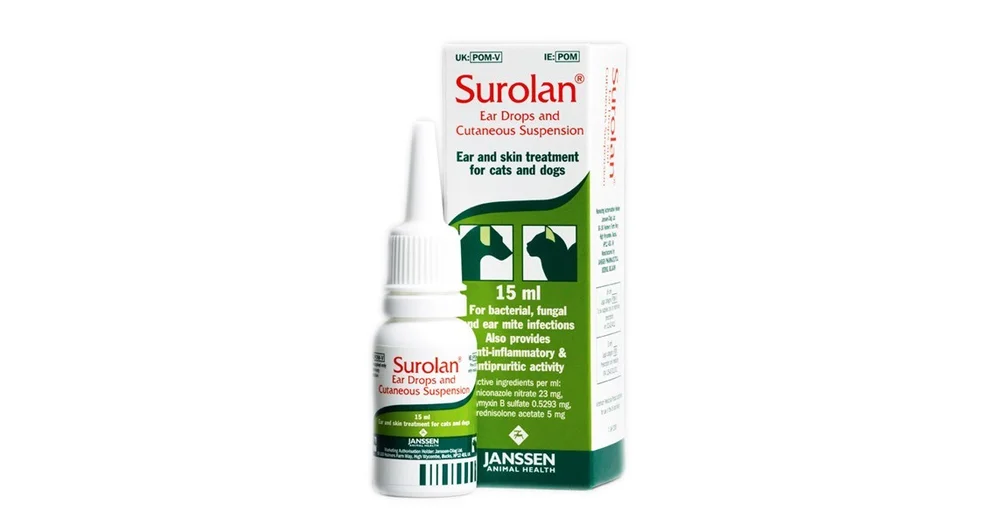Surolan is contraindicated in dogs with suspected or known hypersensitivity to miconazole nitrate polymyxin b sulfate or prednisolone acetate. Sixty nine dogs 95 8 treated with aurizon and 57 dogs 83 8 treated with surolan responded satisfactorily i e cured or clearly improved vet dermatology 2005. Buy surolan suspension 15ml miconazole nitrate 23 mg ml prednisolone acetate 5 mg ml polymyxin b sulfate 0 529 mg ml per 15ml bottle for only 19 90 at petceutics. After cleaning the ear canal apply surolan and ensure an adequate distribution of the preparation by massaging the ear base.