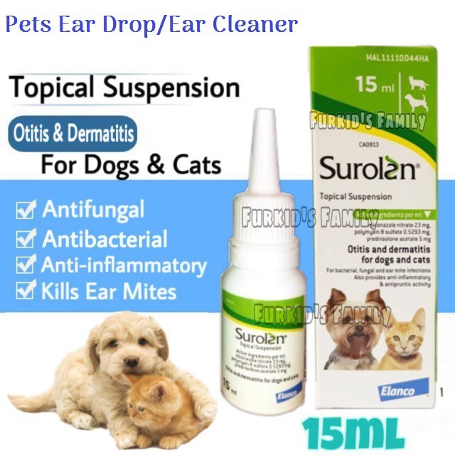 Do not use in dogs with known perforated tympanum. In australia when your dog has an inflammation of the ear issue that is caused by either fungal or bacteria or both a vet will often have a visual inspection take a swab for specific infection analysis give cortisone injections and support it with surolan ear drops or ointment for you to take home and use daily for ten days or so. Do not use in dogs with known perforated tympanum. The external ear should be thoroughly cleaned and dried before the initiation of treatment.